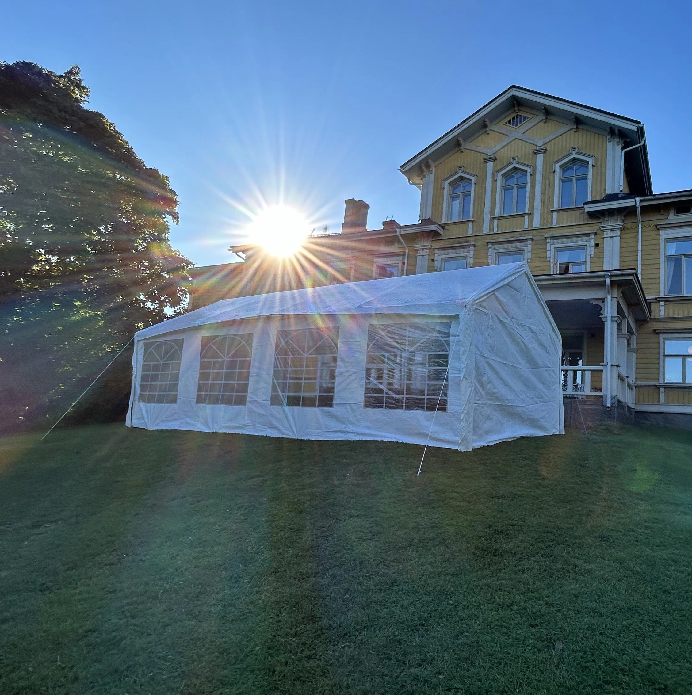 Niin saatiin kesän häät myös käyntiin. Kesäkuun ensimmäiset viikonloput tarjoilivat aurinkoista ja lämmintä säätä, joiden lämmössä juhlittiin useammat häät. Mikä sen parempaa kuin puutarhahäät. Ensimmäiset häät olivat Villa Furuvikin satumaisissa maisemissa. Tapahtumapiste toimitti sinne 5x10m juhlateltan, joka sisustettiin Villan omilla kalusteilla. Teltta toi mukavasti suojaa auringolta ja illan tuulelta. Toiset häät juhlittiinkin asiakkaan omalla terassilla. Kokonaisuus muodostui kahdesta 5x10m juhlateltasta sekä 3x3m pop-up teltasta. Teltat reunustivat avoimeksi jäänyttä tanssilattiaa terassin keskellä. Tänne Tapahtumapiste sai toimittaa myös pöytäryhmät. Viikonloppu sisälsi myös hääkeikan, jossa meidän DJ tanssitti vieraita yöhön asti. DJ pakettiin kuului myös valaistus juhlapaikalle. Ai että kesähäät ovat ihania!
