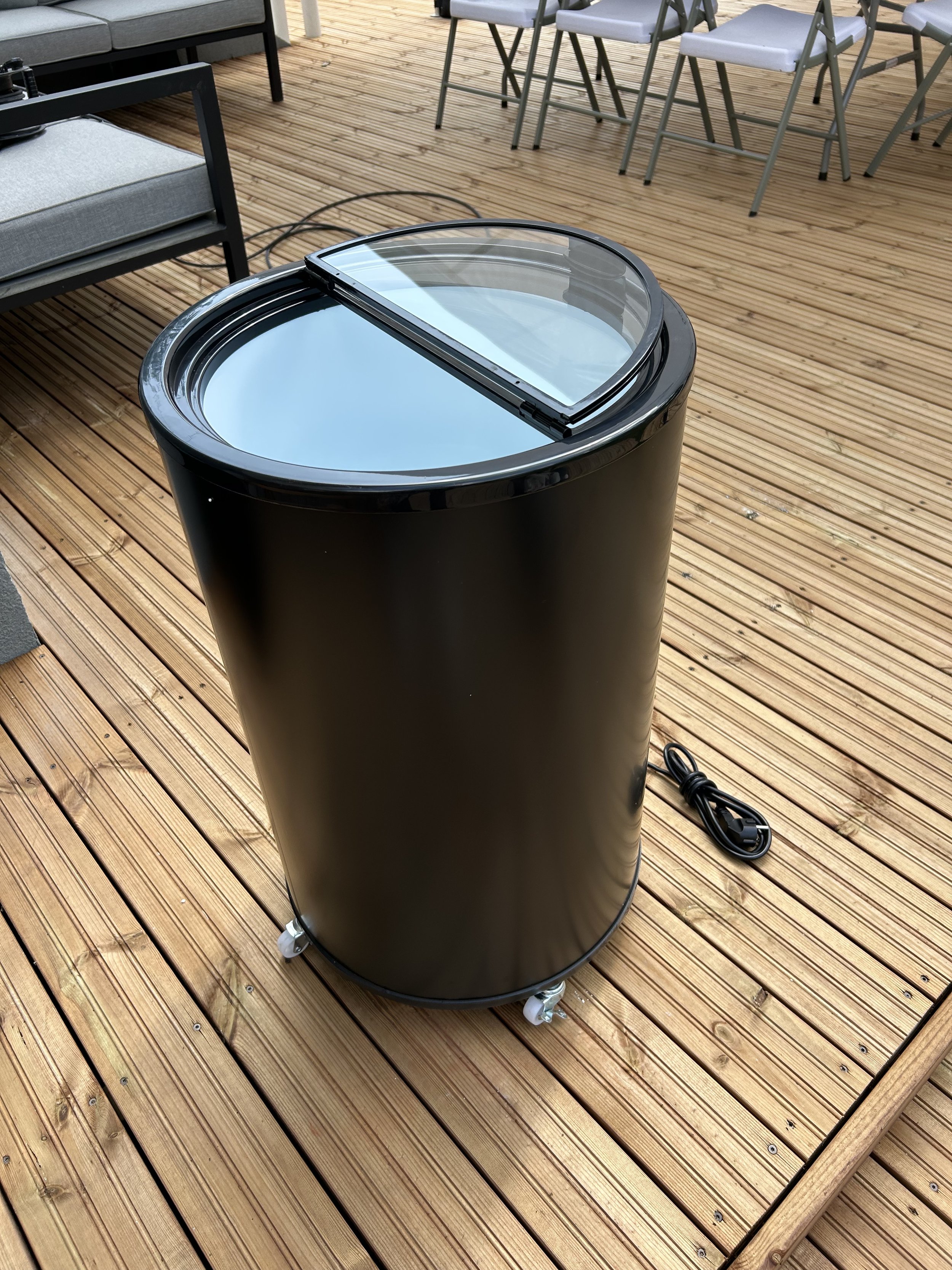 Cooler antaa lisää kylmää säilytystilaa esimerkiksi juomille. Coolertynnyri on tyylikkään musta lasikannella. Cooleriin mahtuu jopa 65 tölkkiä 0,33l tölkkejä. Laite kylmenee nopeasti ja pitää juomat varmasti kylmänä koko illan.